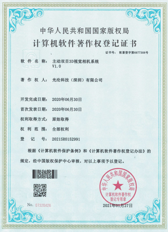 光淪科技工業機器人視覺相機獲得了多項國家專利及軟件著作權,公司自成立以來一直堅持自主知識產權研發工業3D相機!